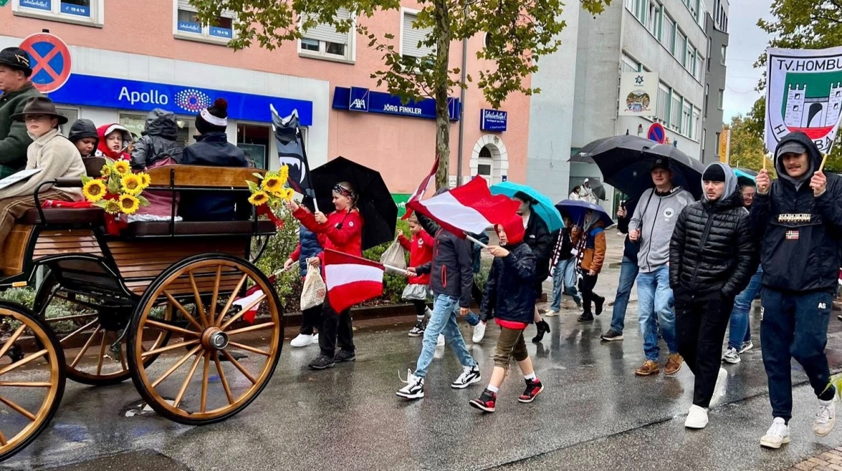 Rund 100 Abteilungsmitglieder kamen zusammen, bewaffnet mit Fahnen, Schirmen und jeder Menge guter Stimmung. Da Homburgs Oberbürgermeister Michael Forster krankheitsbedingt ausfiel – an dieser Stelle gute Besserung! – durften mit Martha, Emma, Jannis und Vincent vier kleine Honigdachse den Platz in seiner Kutsche einnehmen. Sie vertraten das Homburger Stadtoberhaupt mit Bravour und viel Charme. Auf dem Weg zum Festzelt verteilten unsere fleißigen kleinen Honigdachse Vitallutscher der Dr. Theiss Naturwaren GmbH, versehen mit Flyern mit unseren Trainingszeiten, an die Kinder entlang der Strecke – eine süße Geste, die gut ankam.